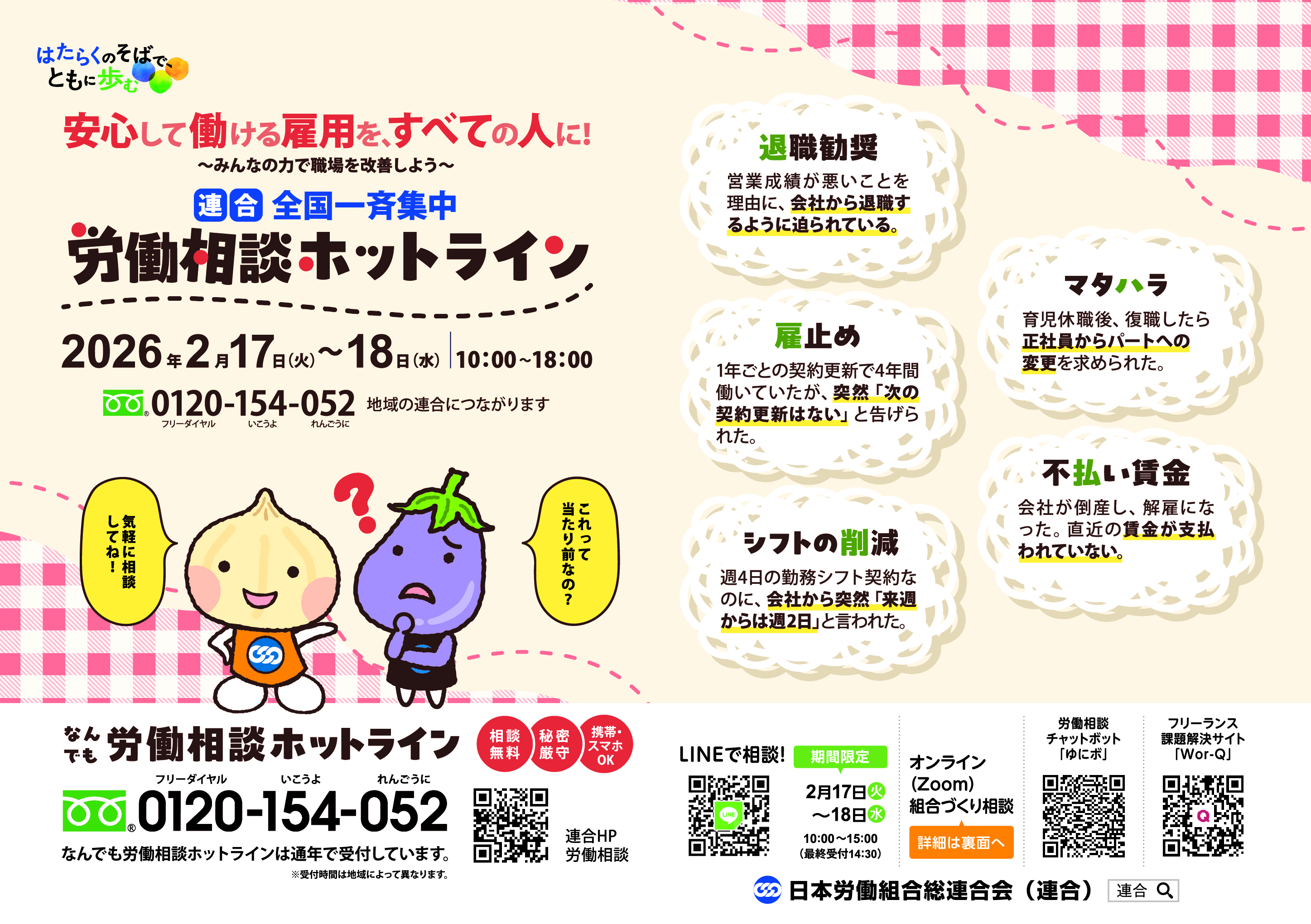 2月17日~18日「全国一斉集中労働相談ホットライン」☎を実施します