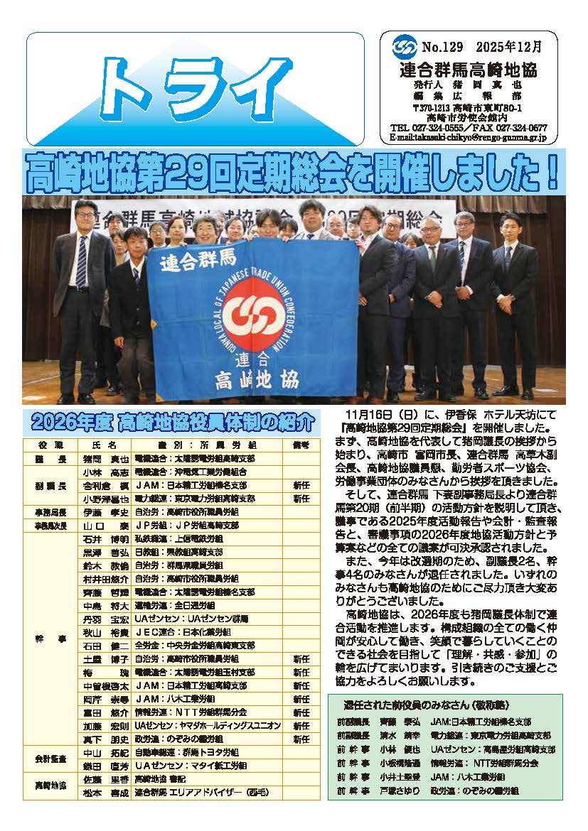 10月26日(土)にGメッセ群馬で「連合群馬第29回年次大会」が開催され、高崎地協からも代議員3名が参加しました。大会では、連合群馬の第19 →続きを読む