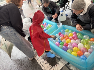 9:00の開会時には本降りの雨となってしまい、今年はお客さまも少ないかなとの予想しておりましたが、イベントがスタートすると、やはり今年も多くのお客さまが雨の中来場され、各展示ブースや物販ブースを楽しんでおりました。多くのブースが様々な大きな看板などを掲げている中、ちょっと控えめな太田地協のブースは、傘を差しての来場となっているお客さまには中々気付いてもらえないかなと思い、手の空いたメンバーがヨーヨーを持ってテントの前に立って通る来場者に声を掛け、また会場内をヨーヨー釣りをアピールして回る作戦に出ました。その作戦が功を奏したのか、徐々に太田地協ブースにも足を止めて頂くお客さまもが増え、行列が出来る程であった昨年同様とまではいきませんでしたが、多くのお客さまに楽しんで頂く事ができました。途中雨が止む時間帯もあり、プールをテントの外に出せる時間帯もありましたが、その後再び雨が降り出し慌ててテント内に戻すなど、今年は終始雨に左右されてしまいました。しかし雨の中でも想定外に多くのお客さまに楽しんで頂く事が出来、参加メンバー一同、一安心といったことろでした。