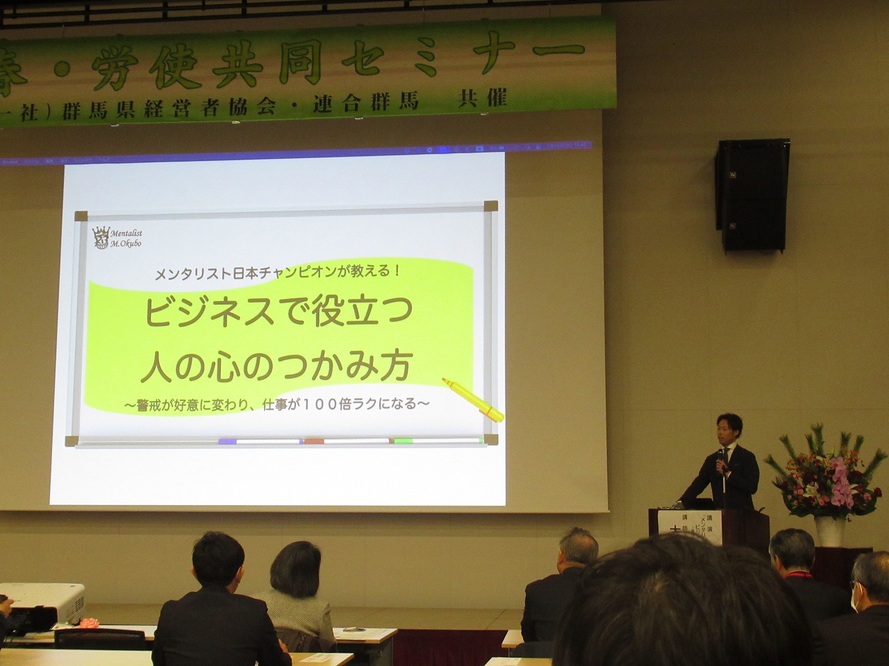 今年は、日本一になったことがあるプロのメンタリストでビジネス心理コンサルタントの大久保雅士さんを講師に招き「ビジネスで役立つ人の心のつかみ方」をテーマに講演して頂きました。