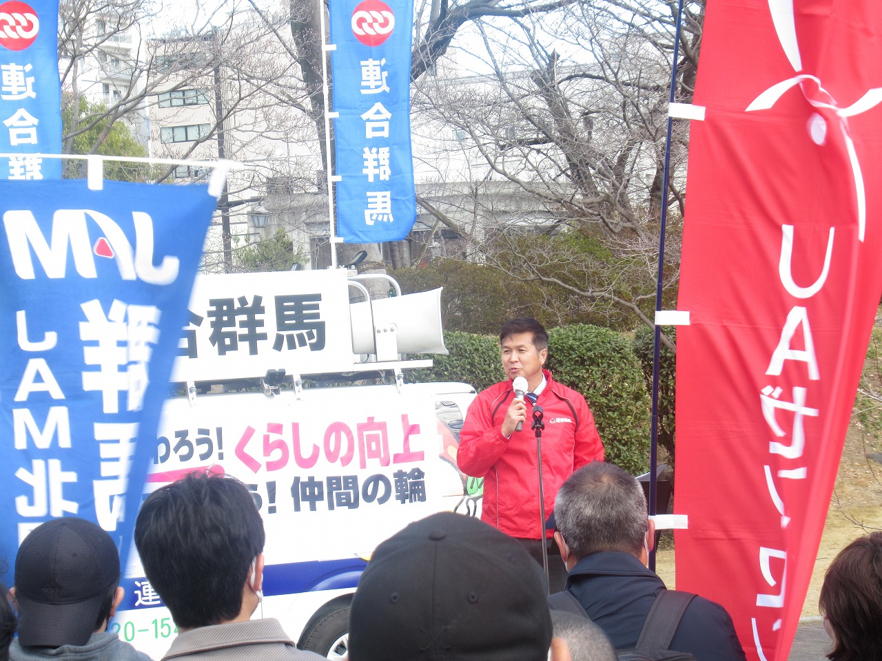 2月28日(土)午後、連合群馬主催「2026春闘決起集会」に高崎地協として猪岡議長と山口事務局次長が参加し、地協議員懇や、幹事役員も各産別労組として参加しました。なぜか今年も、日ごろの郵便配達で雨に降られたことがない事務局次長のおかげで、絶好のアピールウォーク日和となりました。